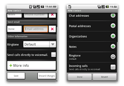 On Monday, we released an early look at the Android 1.5 SDK. Not only does this platform update contain numerous new features, APIs, and bug fixes, but Android 1.5 also brings a new default look for the Android UI framework. After Android 1.0 and 1.1, our designers worked hard to refine and polish the appearance of the system. The screenshots below show the same activity (creating a new contact) on Android 1.1 and Android 1.5: